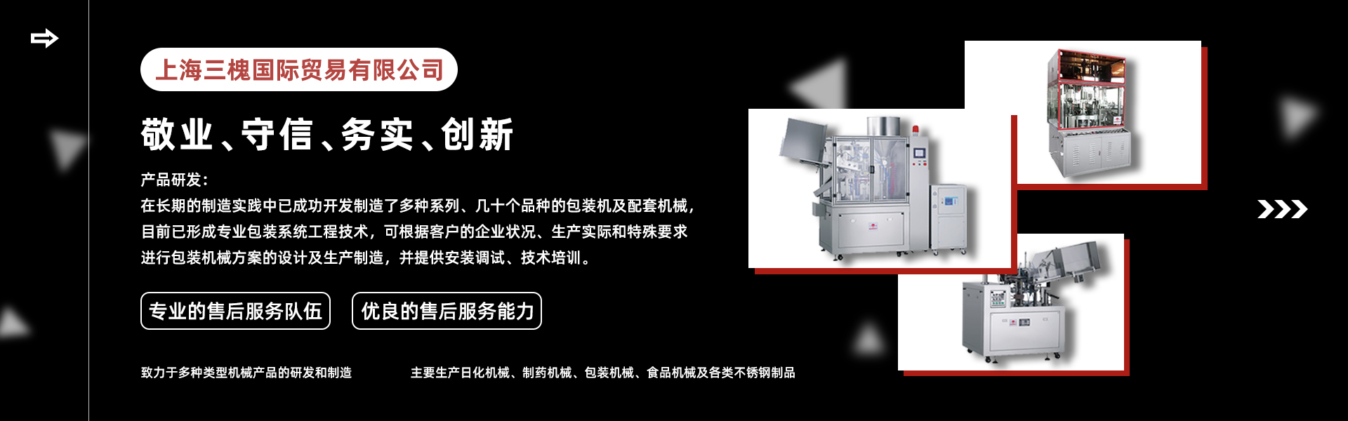 三槐企業有著10多年的發展歷史,是一個跨地區、跨行業,集研發、制造、貿易于一體的企業,旗下有上海三槐國際貿易有限公司、南通通州三槐機械制造有限公司、廣州三槐實業有限公司、尼日利亞奧貢廣東自貿區和旺包裝印刷有限公司。上海三槐國際貿易有限公司同屬三槐企業的下屬公司,以機械產品制造為主體,致力于多種類型機械產品的研發和制造,主要生產日化機械、制藥機械、包裝機械、食品機械及各類不銹鋼制品..